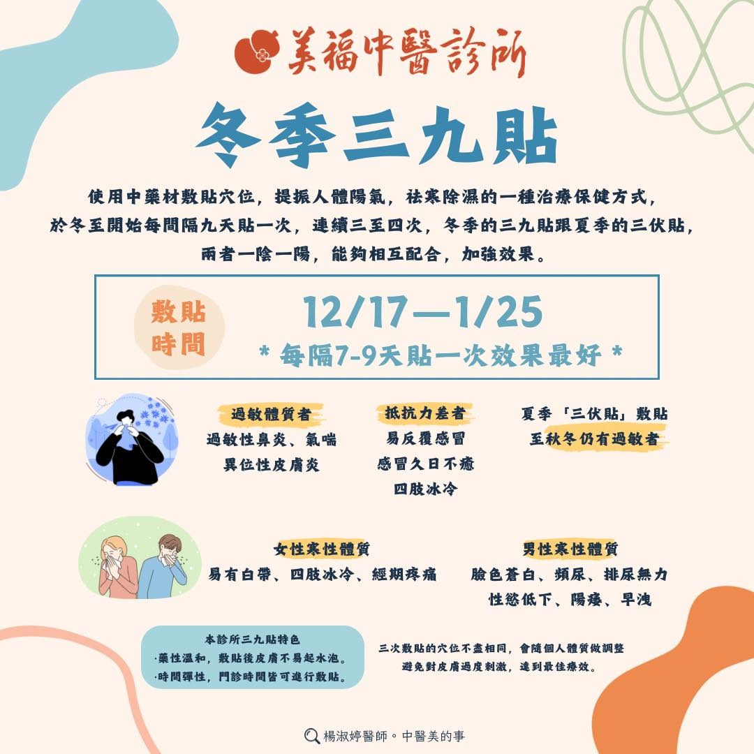 美福中醫診所推出冬季三九貼療法,透過中藥材敷貼穴位,提升陽氣,改善體質。